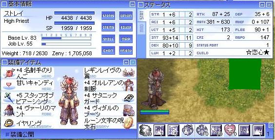 知り合いのたまり場に行ってみた。 今回はそっちで狩りを。 1回目はSYERAさん(弓ローグ)とタルテさん(Wiz)でPD4に。 このときは支援中心で行かせてもらった。 2回目はまささんとほのかさんを加えて修道院3Fに行ってきた。 メンバーはストレイ(HiME) SYERAさん(HiWiz) タルテさん(バード) まささん(パラディン) ほのかさん(プリースト)で。 公平が組めないので、 ストレイを『非公平』で83ー87%→Lv85にすることに。 非公平で2倍なだけあって、 ものすごい勢いで上がって行ったよ!www 途中、ほのかさんは抜けてしまったけど、 狩りは続行。 途中気付いた話だけど、 まささん「ほのかさんいないから公平組めるんじゃない?」 のツッコミで残りの30分ちょいは公平で進行。 ちなみに、3F(ソロ=非公平かな?)は時給30Mでるらしいとか……www この狩りの後、ストレイは無事BaseLv85になりました!w ―――いやぁしかし…非公平での上がり方は異常だなぁ…w