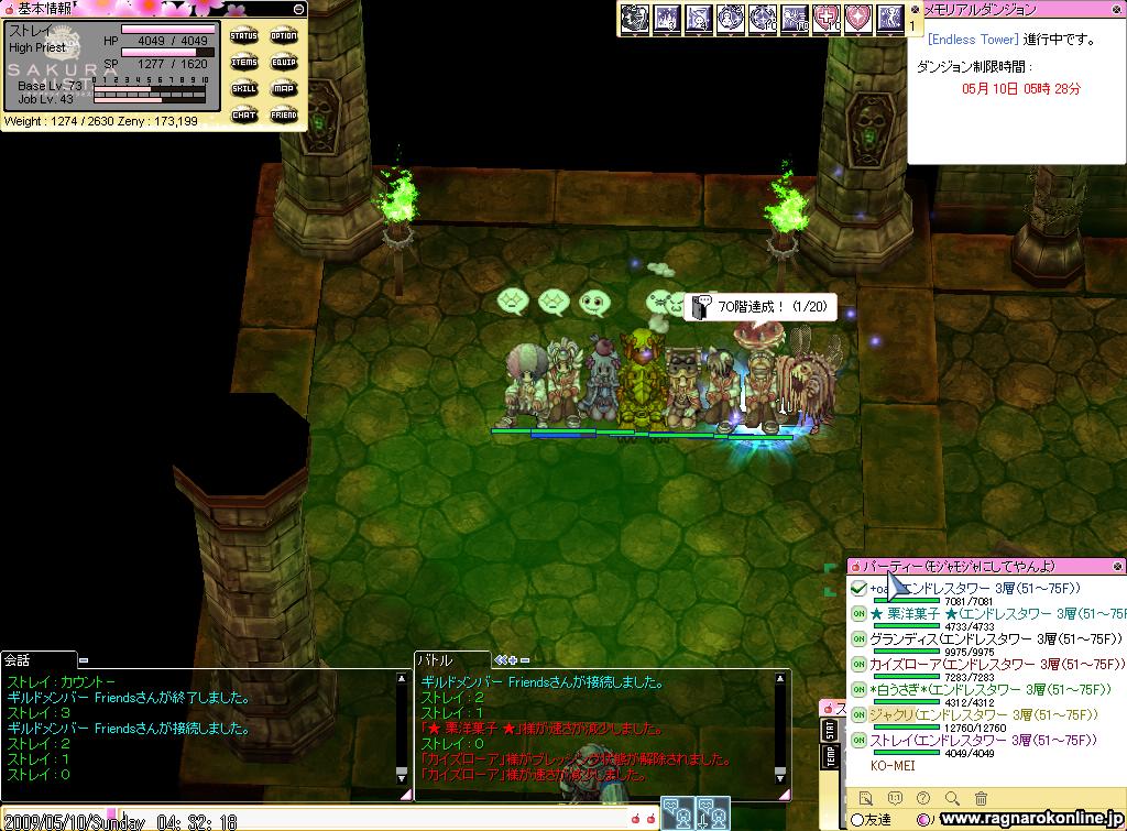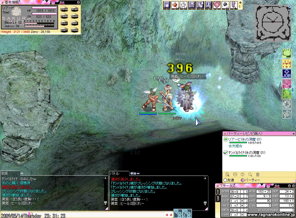 最初はSD5で狩りしてたけれど、PD4の方がいいじゃないか? ということで、PD4に。 だけど…その時のうちには会話に参加も狩りの様子を見る余裕もあんまりないww だってPTが自分入れて8人(うち、蒼さん、+oa+さん、ナツさん、ROCKさん、(セラフの)姫さん、ティティスさん、不明さん)だし。 アスムを切らさないように回すだけで行動が半分以上制限されるww SPは切れなかったのは幸い。(ヒールはあんまり使ってなかったしね