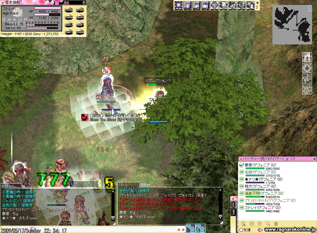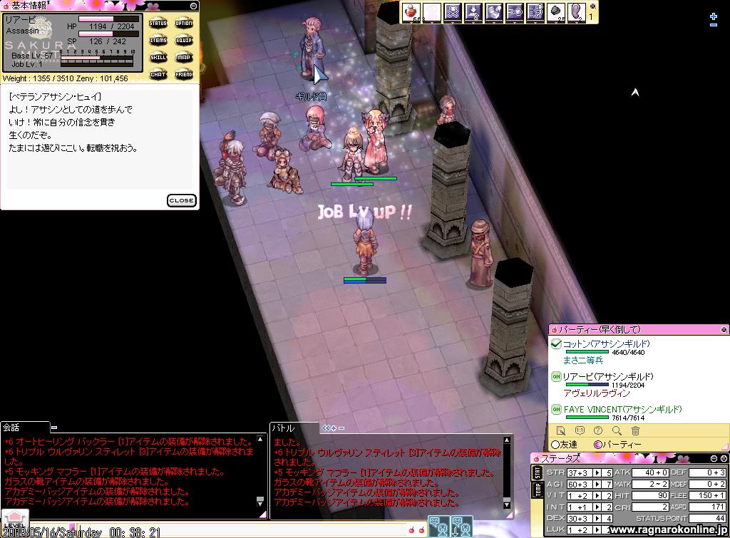 土曜~日曜のオールを紹介してみる。(流しっぽいけどねw 土曜のG集会もひと段落し、 忍者をやるナツさんと一緒にチルピリーヴイ(=ストレイで忍者)と育成。 1時~12時30分ぐらいまでやって、 ポリン島→(始めからの)アカデミーを80%ぐらいまで進行した。 たまり場でマッタリしてたら、蒼さんが再びログイン。 「なにもやることがない」と言ってたので、 ストレイとセージあげることにした。 これがその狩りの一部。 生と死との狭間をいききしてたよwww 支援とか、転がった時のモンスター排除とかいろいろした忙しかったけれど、 いい経験になったし、 スリル満点で楽しかった!w(スリルありすぎだ!!とか飛んできそうww 21:00~は、人数集めて70代でゲフェニアに行ってきたw カードとか出ると良いなとひそかに思ってたけれど… 当たり前だけど、そんな都合よく出るわけないよねw これはその一部。(転がった人を起こして助けるのも立派なプリースト系の仕事です!! 日曜の夜寝る前にまたナツさんとアカデミー進行。 後試験2つw 忍者のこれからが楽しみだなぁw