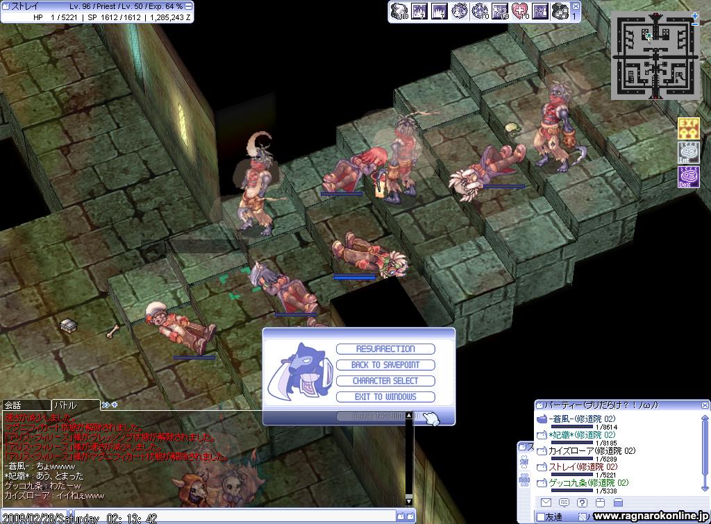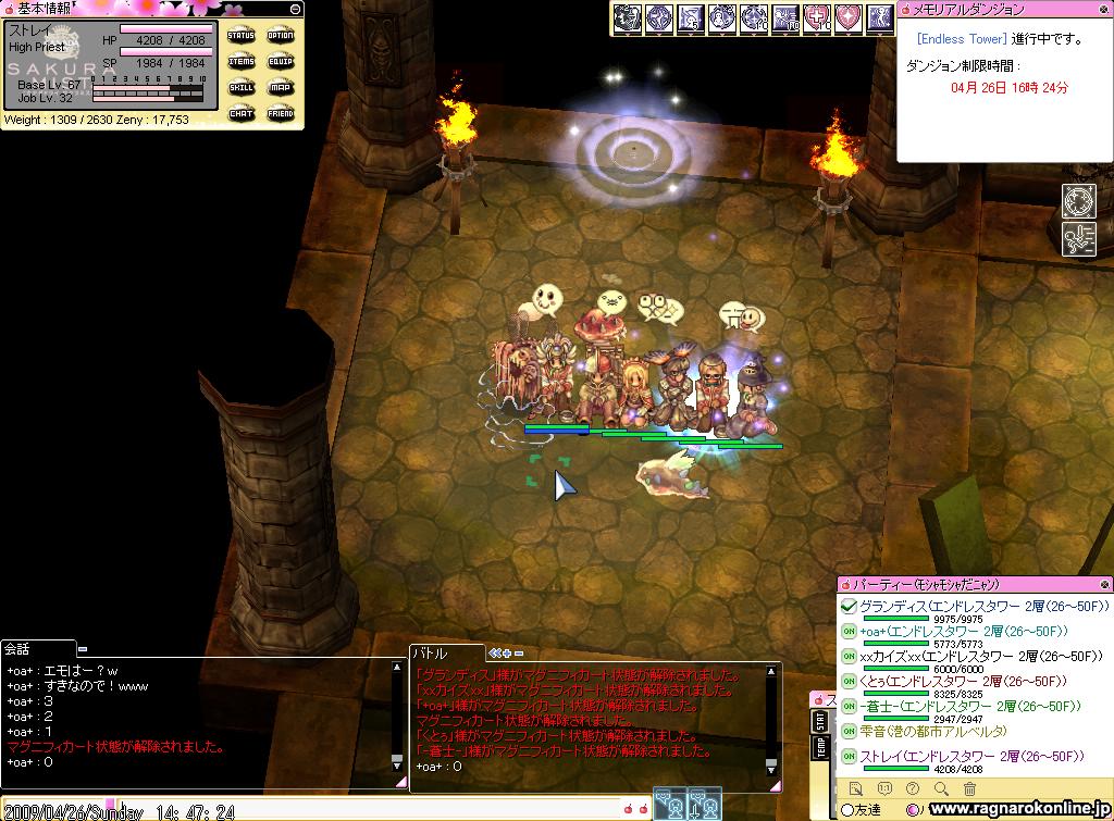 メンバーは蒼士(アルケミスト)と雫音(パラディン)とくとぅ(Vit型プリースト)とグランディス(HiME)と+oa+(アシッドデモンストレーション型クリエイター)とカイズ(SBR型アサシンクロス)とストレイ(HiME予定の支援ハイプリ)。 金銭にあんまり余裕のない自分としては10k払いたくないけど、はらってETに突入。 1Fのポリン集団から始まって、順調に進んでいったのだけど…… 途中蒼さんのパラディンがサバキャンに(´・ω・`) (ETは1Fごとにいる敵を殲滅してから次の階にという形式みたいだった。) (…時々BOSS(またはMVP)クラスのモンスターがいるけど。) モンスターの情報を調べつつ、1Fづつ慎重に上り、 25F到達し、30F…35F…40Fと行って、45Fのオシリスを何度か全滅して倒したところでギブアップ><; ちなみに、ETでの主戦力はMEと、SBRとアシデモでしたw デスペナルティが10%ぐらいいってしまったけど、楽しめたし、まだLV67なのですぐに取り戻せるからOKw 機会あればまたET行きたいものですw 何度か転がりながらも39Fに到達!! よくこのPTで行けたものだ……w