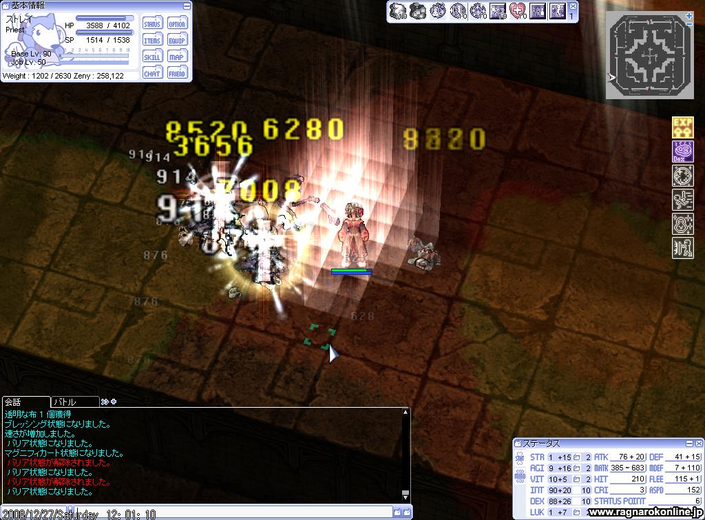 ―――でもまあ、とりあえず、今日のROの記録から。 いつも通り、タタミオンライン満喫してたら、 ティティスさんから追い込みの手伝いを申し込まれて、 ティティスさんとハンターペアで調印に行ってきたw その後、BaseLv64 JobLv48まで上がって、 めでたくハイプリーストに転職w 転職後は再びティティスさんとハンターペアでアルデバラン時計塔2Fに。 そこで、アスムプティオとマグニフィーカートなどを習得。 さらにそのあとはカタコンでヒール砲狩りしてJobLv23にまでUPw(ちなみに、戦闘教範とJob教範を今日の転職前から使ってます。おかげですごく早く育成できたw 待望のハイプリになれて、感動&達成感と脱力感といろんな感情がw 次はMEの習得とDEXをはじめとするステータスUPが目標。