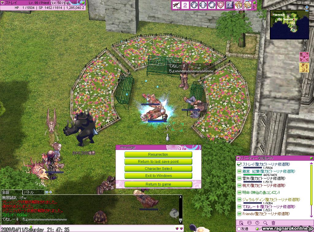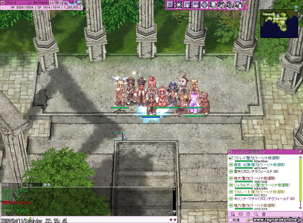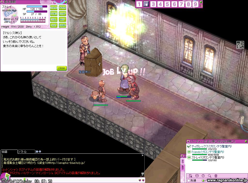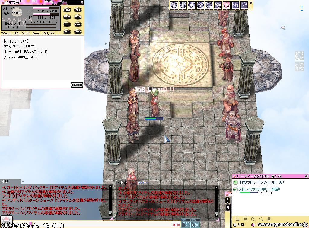 追い込みもようやく終わったけど、早くハイプリーストにしたいためか、追い込みの気分が抜けてないww まあ、今回はそのいきさつでもどうぞw 追い込みはカタコンMEソロが中心だけど、気が向いたときにGD3いってた。他にG狩りとか、フレンズさんや知り合いのSYERAさんとコットンさんが引っ張ってくれたりもして、すごく助かったね!w 2009年4月11日 ストレイ発光式。 なんとかここまでたどり着けた! 追い込み協力者、ありがとーw 追い込みの最後の方は1日5%上げを目標にひたすらカタコンME(教範でEXP+50%とアンデットバスターのシューズEXP+10%もいれてやってて、30分で大体700k) ちなみに3時までやってた時もあったね(すごく眠かったなぁ……w あ、そうそう、発光式後の枝祭りは100本中当たりが5回ぐらい出た。 モロク天使に、 モロク物質型に、 トール火山のカーサに、 パンダなタナトスの憎悪に、 アビスのハイドラに。 ちなみに、そのときうちは転がらないように注意しながら起こし役してましたwww 発光式後、ストレイはすぐに転生。 フレンズさんのAX、樟子さんのAX、クイナさんのAXもいっしょにストレイの転生にきたw 初オーラに初転生と、すごくうれしいねw 転生した後はクイナさんとフレンズさんに引っ張ってもらって、すぐにアコライトHighに転職したよ!! ハイプリーストまでもうひとふんばりw!! 今現在はBaseLV55のJob40ですw もうちょいのように見えるけど、まだまだこれからなんだよね・・・w