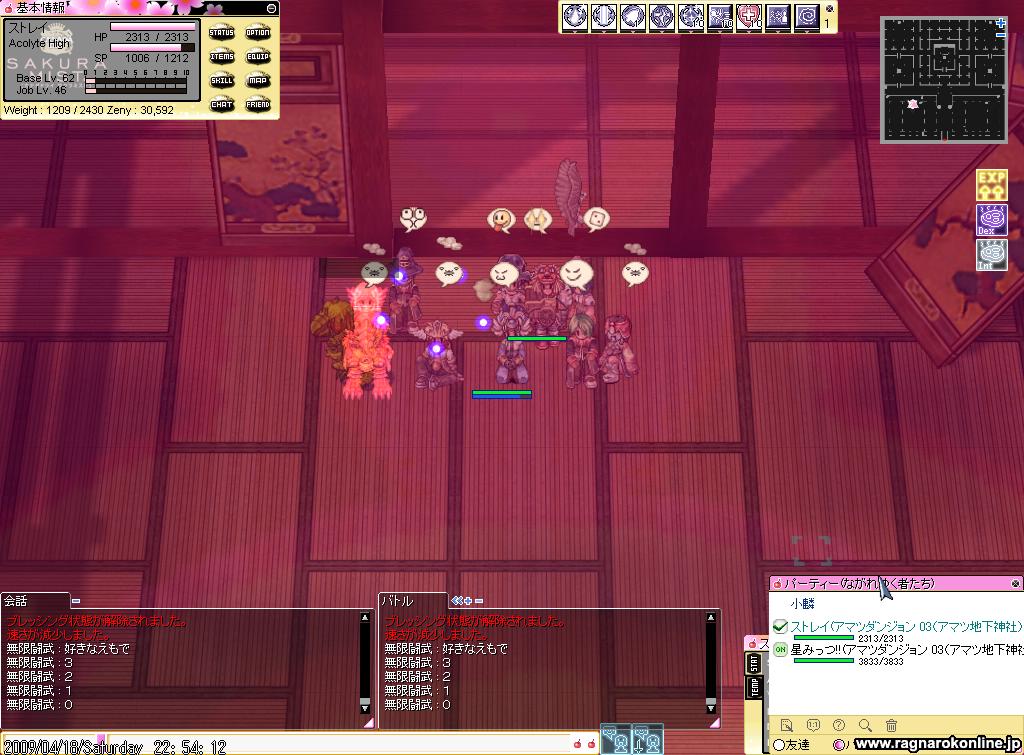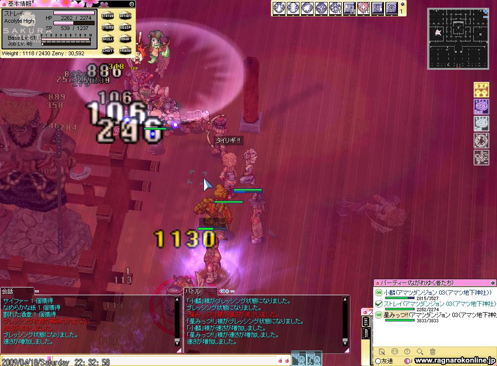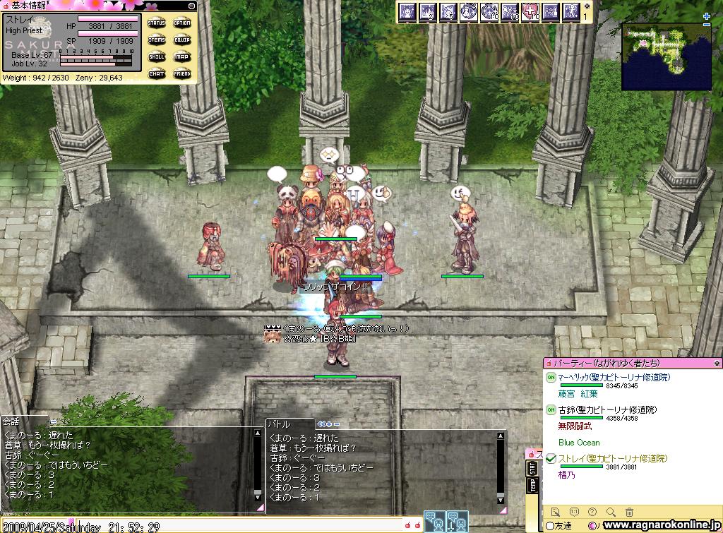 2回目はエスマリンカーで参戦w 前回より4人多い、11人PT(今回も蒼さん2PC)でいってきた! PT構成は ハイプリ2(カイズ、蒼さん) プリースト2(+oa+さん雪さん) ハイウィザード1(蒼さん) エスマリンカー1(自分) クラウン1(グランディスさん) AX1(クイナさん) 拳聖1(桃犬さん) ウィザード1(マーベリックさん) ガンスリンカー1(樟子さん)。 40Fのストームナイトで全滅するまではスイスイ進んだw 主にウィズさん達の火力がすごくて…w ちなみに、うちはいまいち属性について知識なかったけれど、とりあえずエスマ連発&ウィザード系に魂してたw(SGとかLOVで画面が見にくくかったけれど気にしないw