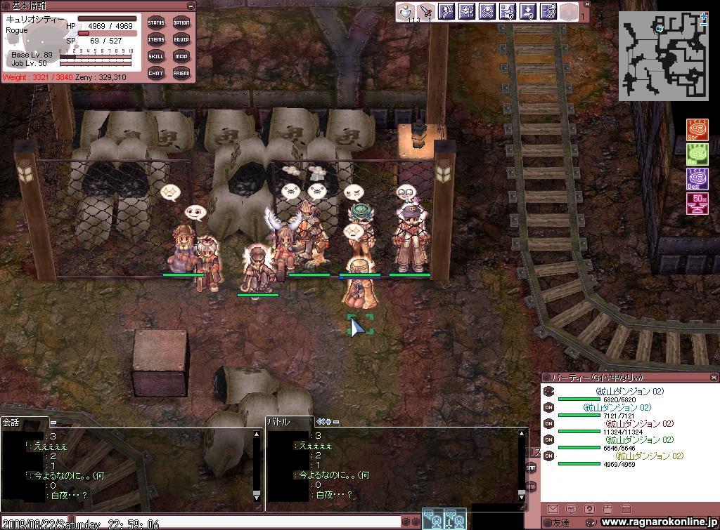 ので、ローグのギルドメンバーたちと一緒に 3つあるうちの1つの「上級者向け」に行ってきた。 ※海底洞窟にはコースが3つあって 「初心者向け」(BaseLv1~40まで) 「中級車向け」(BaseLv1~70まで) 「上級者向け」(無制限) となっている。 海底洞窟に入ったら、分岐のマップはアビスレイク1のマップ…w 「上級者向け」の方に入ったら MAPは伊豆3F(1つ目)と伊豆4F(2つ目)と伊豆5(3つ目)…w うちらは3つ目のフロアで固定狩りをした。 メンバはAX1 HP2(@ストレイ) バード1 クルセ1 ロードナイト1。 火力はうちのMEとクルセさんのGXがメイン…。 沸きが少ないように感じたのは人が多いだけで、 いなくなると、次々と敵が横から湧いてきた…w 最初はSPがきついものの、何とか狩りをできてはいたが、 クルセさんが都合によって帰った後はバランスが崩れ、 不死悪魔以外の殲滅が間に合わなくなり、 バドンXの2度目の登場+横わきにより 圧死して終了した……。 敵はバドンX ゾンビスローター ゾンビマスター ジェネラルスケルトン バンシー ネクロマンサー デスワード ブラッディマーダー デッドリーレイス。 ちなみに、バドンXは2体沸いていたのが確認したので MAPに複数存在している模様……。 バドンXは前衛さん(LK)が200程度のダメージと受けるダメージの低さ。 AXさんがSTRが高くないらしい(後で聞いた)のもあるけれど、 100以下のダメージでとても硬いのがうかがえた…。 なのでかたい以外はそんなに強くないことがわかった。 今回は6人で行ったが、 少人数で行って狩りするとおいしそうだw あと、ポイントラリーのためたポイントの交換もあった。 1P……アイスクリーム50個 3P……2種類のジュース(ブドウジュースとチョコレートドリンク)のうちどちらかを10個 5P……3種類のお菓子(ルーンミッドガッツ産のお菓子と他2種類)のうちどれかを5個 だった。 ルーンミッドガッツ産のお菓子はATK+5 MATK+5で10分間だった。 期間が終わるまでにお菓子>ジュースで交換しようかな……。 後はかにニッパの頭装備がもらえるクエ+依頼 ポイントラリーの暇つぶしなど…。