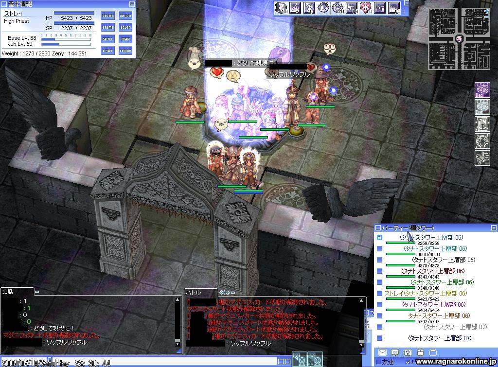 昨日の1セット(1時間30分)を終わってとりあえず中断。 その後はたまり場でしばしマッタリタイムw マッタリしてる間、ふと思い出した。 「そういえば、樟子さんの方のG狩りは人が少ないんだったっけ」と。 なので「いきなりだけど、行っても大丈夫かな?」と思いつつ行ってみた。 樟子さんからはOKが出たので参加してみたw その狩り場はME主力での修道院2F。 メンバはナイト プリ(樟子さん) ハイプリ(ストレイ)。 沸いたネクロによって1度転がってしまったものの、 おおむね順調に狩りができたw Baseは約5% Jobは約3%増加w 早くメディタ覚えて3kヒールもしたい!w 転生後はなかなか上がらんのは知ってるからマッタリ行くけどねw (やる気ないだろとかは突っ込まんようにw そのあとはさらにマッタリモードPart2w 樟子さんの方のG、結構面白くていいねぇw あっちのGの人もきていいとのことなので 暇あれば行こうかなw
