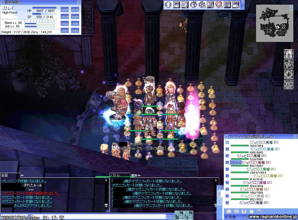 ジュピロス廃墟1Fの階段横で温もりで固定狩りしたw メンバーはLK1 金剛チャンピオン1 クラウン2(ニヨとブラギで2) ダンサー1 HP3 拳聖1 ウィザード1 かな。 フォーメーションはこんな感じで狩りしたw うちはジュピロス廃墟で温もりがあること自体知らなかったけどね!w 今回はLK2ではなくLK1だけど、 前衛が2で、 前衛さんのSPが切れなければ もっと出たかも。 ―補足として。― 前衛さんが外PTだったのでマグニフィカートがこなく SP切れを起こしていたので、 外PTにもプリさんがいたらよかったかな?と。 それに、HP3でLK1だったから 支援もあまっちゃってたしねw あと、拳聖やってたメイデンさんが SPが足りなくなることと、 ターゲットがうつったりもして、 何度かころがったりもしたね。 今度は時間を早めにして、 メンバーもちゃんと揃えて また狩りをしていきたいw ―――ついでに。 昼間はローグで1時間+1時間30分ほど鳥人間ソロでやってきた。 GV中にも行ったけれど、 やはり、こっちもその時間帯はすいている方だったw 昨日の中断分1時間と今日の分の半分の1時間30分。 明日はやりそびれた分も追加かな・・・w アイテムの方は順調にたまってきてる。 今倉庫には1750個ぐらいあるしね。(今日は2000個行きたかったけれど、昼間は寝たり、別のゲームやってたりしてまったりしてたからね。 LVもBase81になったw こっちもまだ上がるかな…w うちは、倉庫に30k個たまるまでは、狩り場は変えないつもりでいる。 そのあとはFREE267(=ペノメナのFREE95%)になってたら そっちを狩りに行きたいねw さんごもたくさん貯めるのだ!w